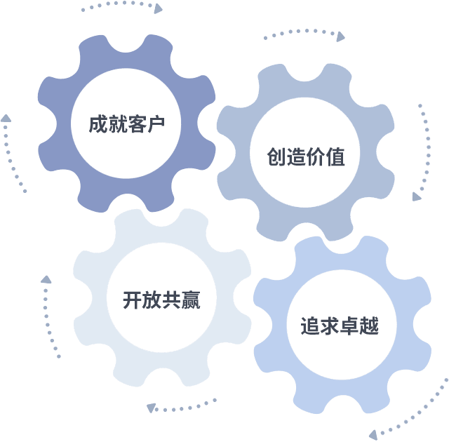 成就客户是一切决策的出发点,,,创造价值是衡量所有工作的标准,,,,追求卓越是我们做事做人的态度,,开放共赢是我们的格局也是最终的结果。。。价值观的齿轮环环相扣,,推动着组织里的每个人不断向前。。